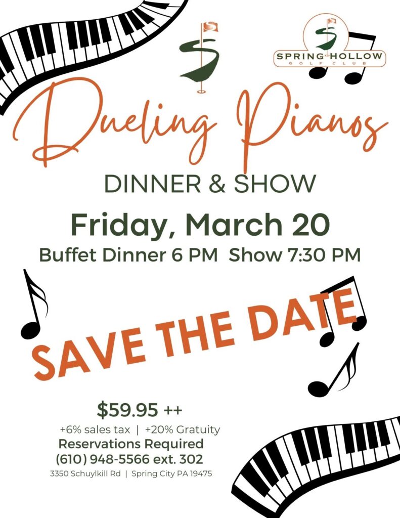 Dueling Pianos March 20, 2026 #image_title + Add to Google Calendar + iCal / Outlook export 00 days 00 hours 00 minutes 00 seconds Date Mar 20 2026 Time 6:00 pm - 11:00 pm Location Spring Hollow Golf Club 3350 Schuylkill Rd Organizer Organizer Name Share this event SearchSearchRecent PostsPlanning a Golf Outing for a Fundraiser in Philadelphia Why Host Your Summer Wedding at Spring Hollow Golf Club Planning a Holiday Party at Spring Hollow Golf Club Planning a Rustic Wedding at Spring Hollow Golf Club Recent CommentsNo comments to show.Archives January 2026 December 2025 November 2025 Categories Fundraisers Uncategorized Weddings