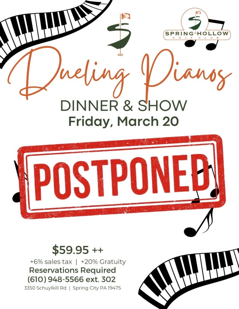 Dueling Pianos POSTPONED #image_title + Add to Google Calendar + iCal / Outlook export Date Mar 20 2026 Expired! Time 6:00 pm - 11:00 pm Location Spring Hollow Golf Club 3350 Schuylkill Rd Organizer Organizer Name Share this event SearchSearchRecent PostsPlanning a Golf Outing for a Fundraiser in Philadelphia Why Host Your Summer Wedding at Spring Hollow Golf Club Planning a Holiday Party at Spring Hollow Golf Club Planning a Rustic Wedding at Spring Hollow Golf Club Recent CommentsNo comments to show.Archives January 2026 December 2025 November 2025 Categories Fundraisers Uncategorized Weddings